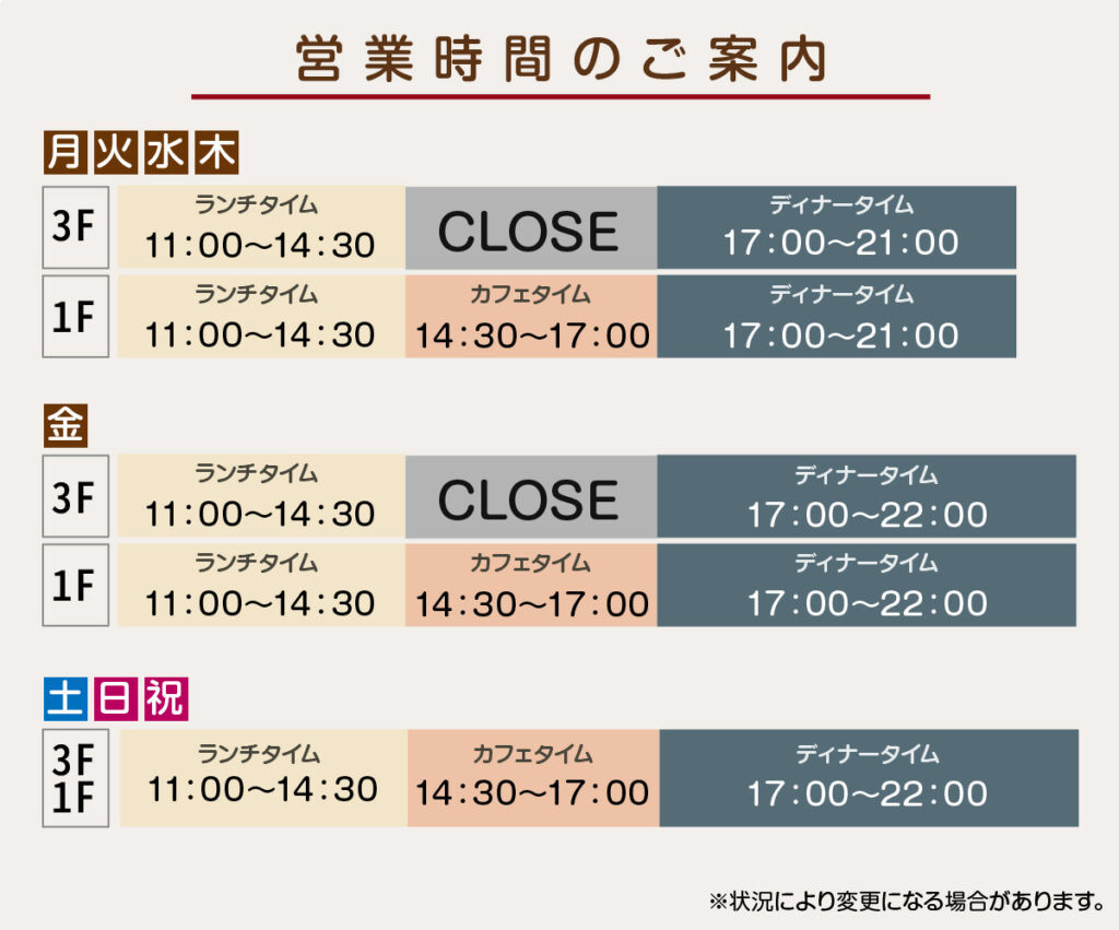 ランチタイム[1F・3F] 11:00~14:30(14時 ラストオーダー)