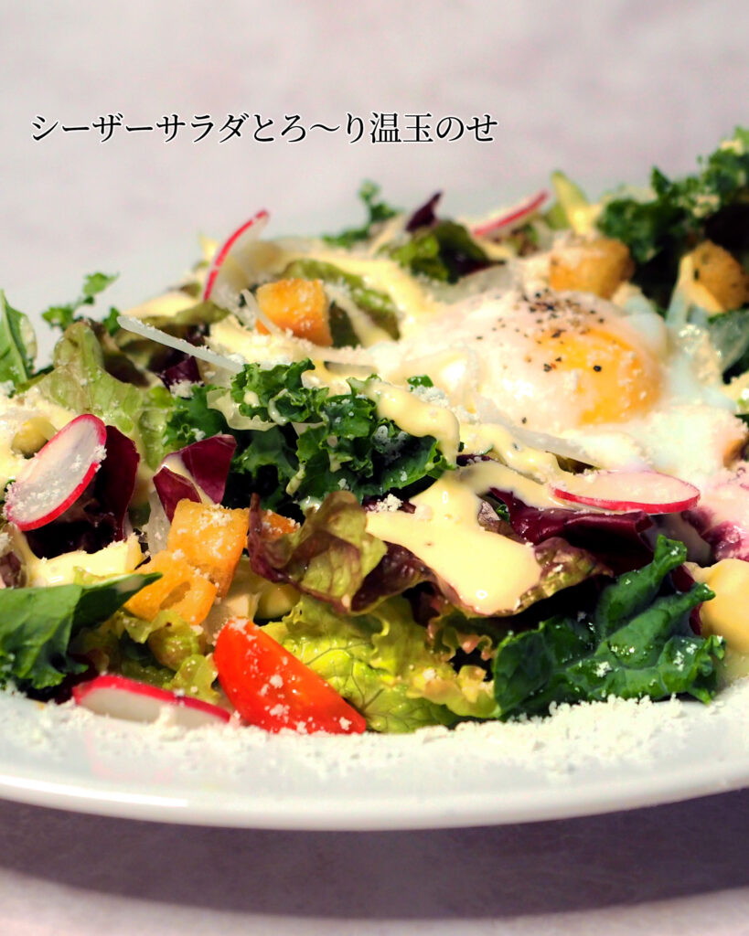 シャキシャキの新鮮野菜と、たっぷりグラナチーズ、シーザードレッシングに温泉卵をトッピング
