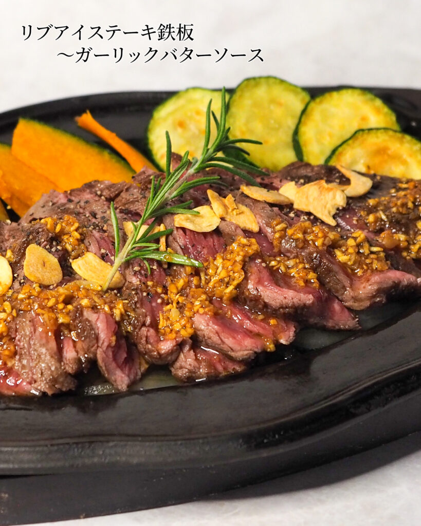 赤身と脂のバランスが絶妙なリブアイを鉄板で香ばしく焼き上げました。