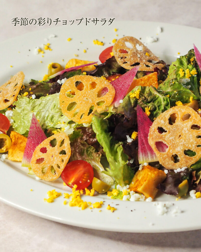 旬の野菜やポテトを細かく刻み、揚げレンコンをミックスしたヘルシーサラダ。特製コブドレッシングのまろやかさに、コブみかんの葉のフレッシュな香りが絶妙に調和しサラダの味わいを引き立てます。