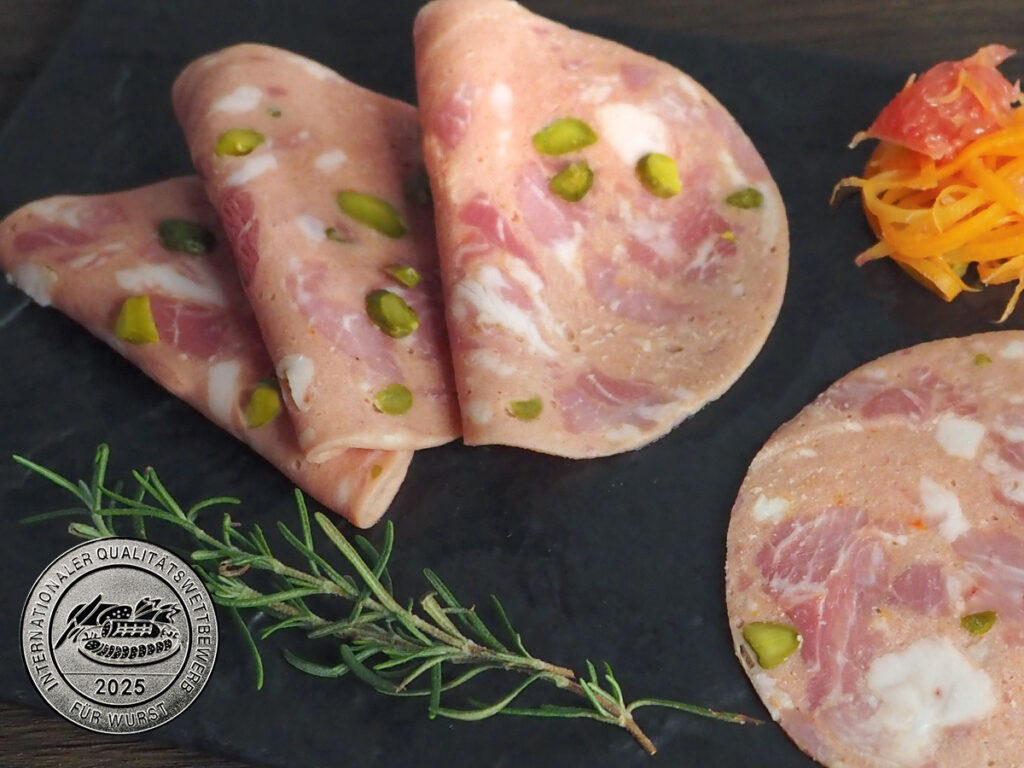 シンケンとはドイツ語で「ハム」、ビアは「ビール」。ビールに合うハムというその名の通り大きなソーセージで、大判のケーシングに練った生地を詰めています。角切りの豚肉とピスタチオが肉の旨味と優しい味わいを引き出します。